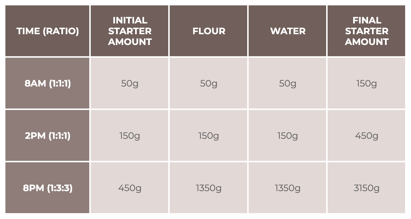 - Start with 50g starter + 100g flour + 100g water = 250g total